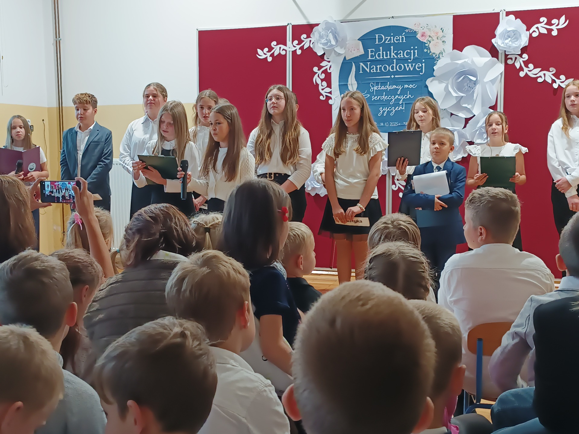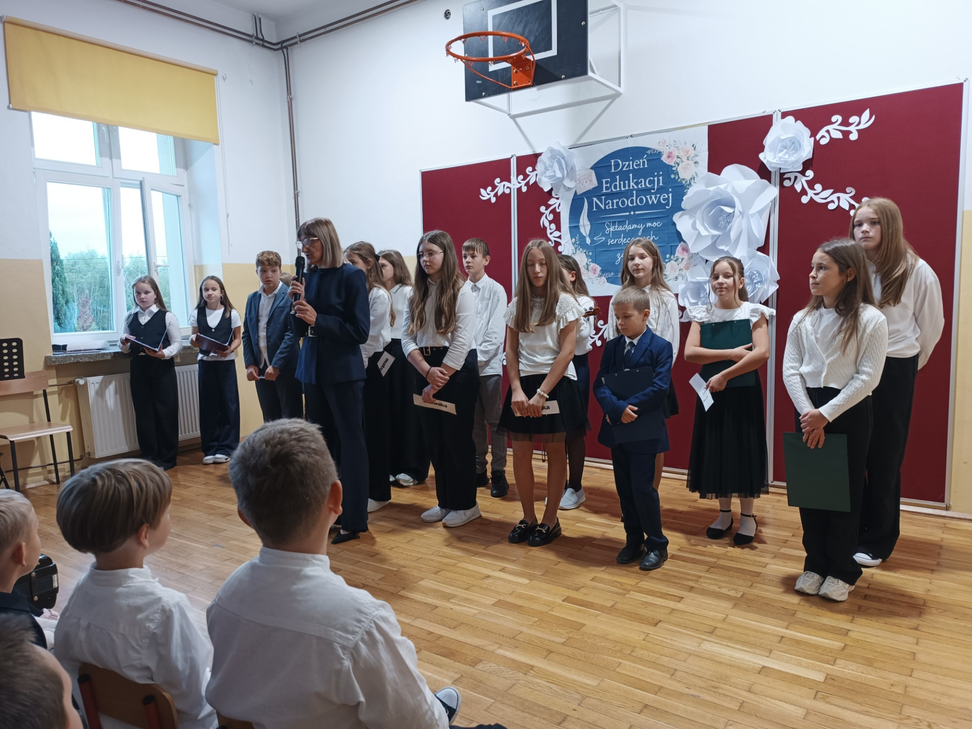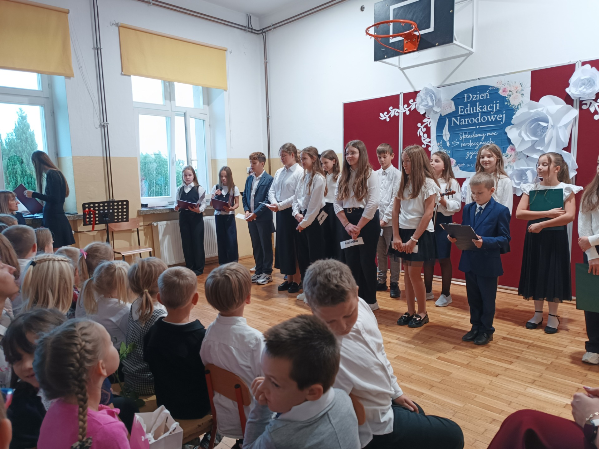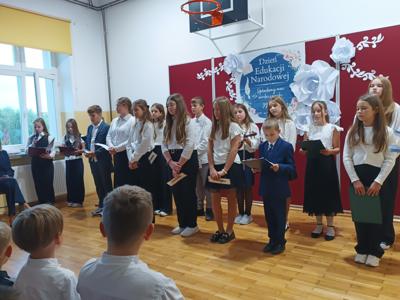 Z okazji Dnia Edukacji Narodowej uczniowie klas 5 i 6 przygotowali akademię, która na długo pozostanie w naszej pamięci. Uroczystość była pełna wzruszających chwil, pięknych słów i muzyki prosto z serca. Wspaniały koncert życzeń skierowany do Pani Dyrektor, nauczycieli, emerytowanych pracowników, rodziców, pracowników obsługi i administracji wywołały uśmiech i wzruszenie wśród obecnych.