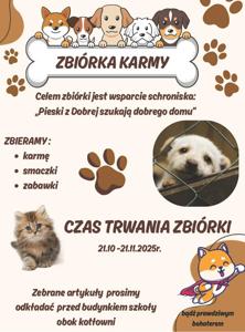 kolejny rok z rzędu nasz Samorząd Uczniowski organizuje akcję charytatywną „Zbiórka karmy”, której celem jest pomoc zwierzętom przebywającym w schroniskach i domach tymczasowych. Celem zbiórki jest wsparcie schroniska: „Pieski z Dobrej szukają dobrego domu”.