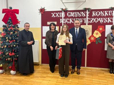 W naszej szkole odbyła się uroczystość rozdania nagród w XXIII Gminnym Konkursie Mickiewiczowskim. Wydarzenie było podsumowaniem konkursu kaligraficznego „W kręgu Mickiewiczowskich liter” oraz konkursu plastycznego „Światy wieszcza zaklęte w pudełku”.